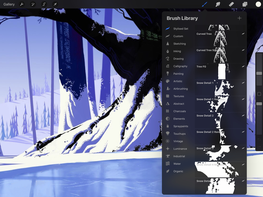 There's two time lapsed pieces of footage totaling 7 minutes from procreate that are non voiced, but will give an idea of how the brushes are used.