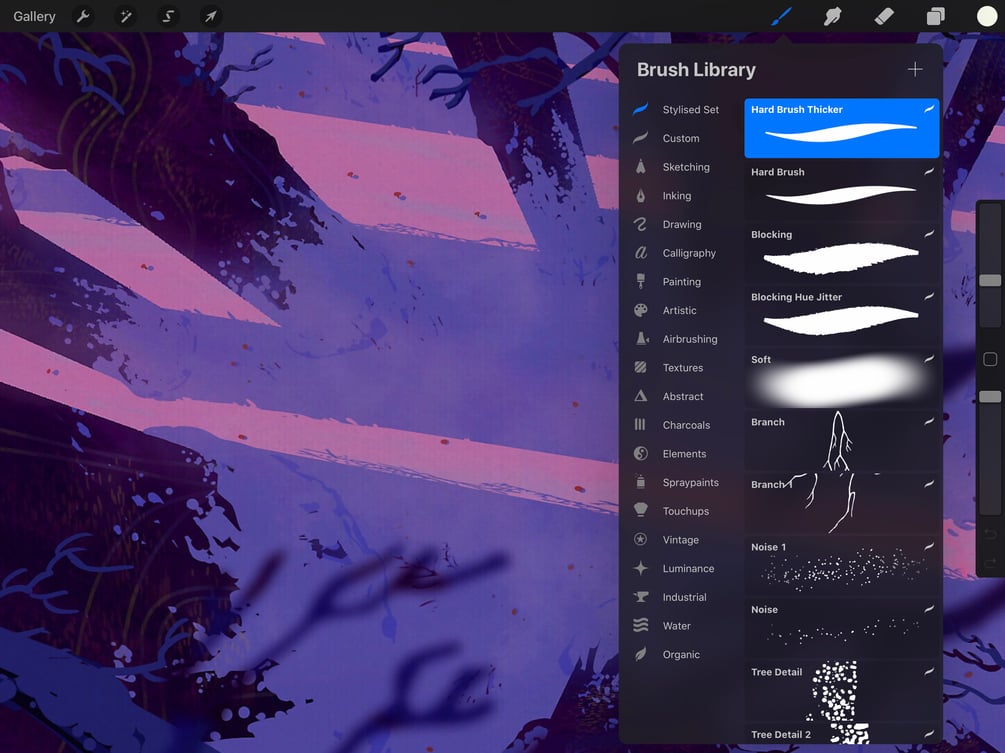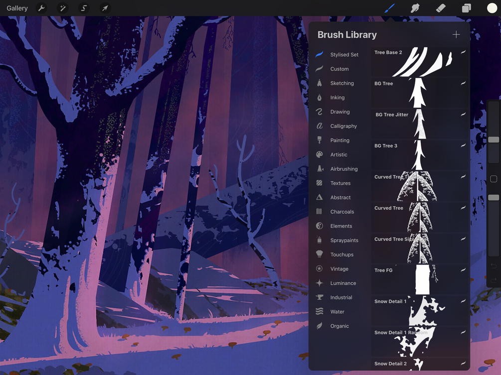 There's two time lapsed pieces of footage totaling 7 minutes from procreate that are non voiced, but will give an idea of how the brushes are used.